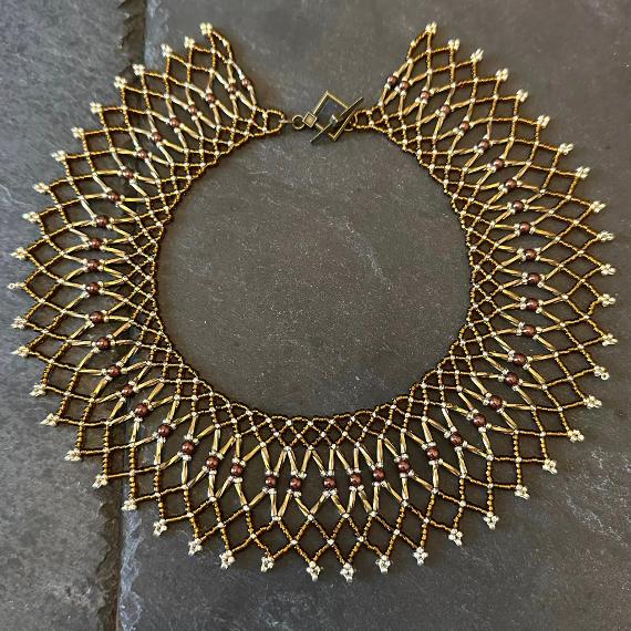 This pattern contains instructions for a necklace made using seed beads and a needle and thread.