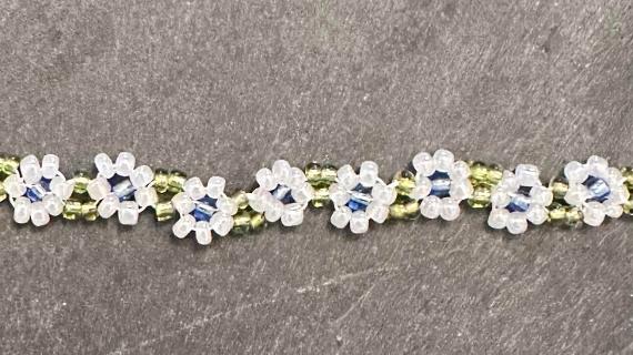 This pattern contains instructions for six different versions of daisy chains in a zigzag shape, along with a straight version of one of them, made with seed beads and a needle and thread.